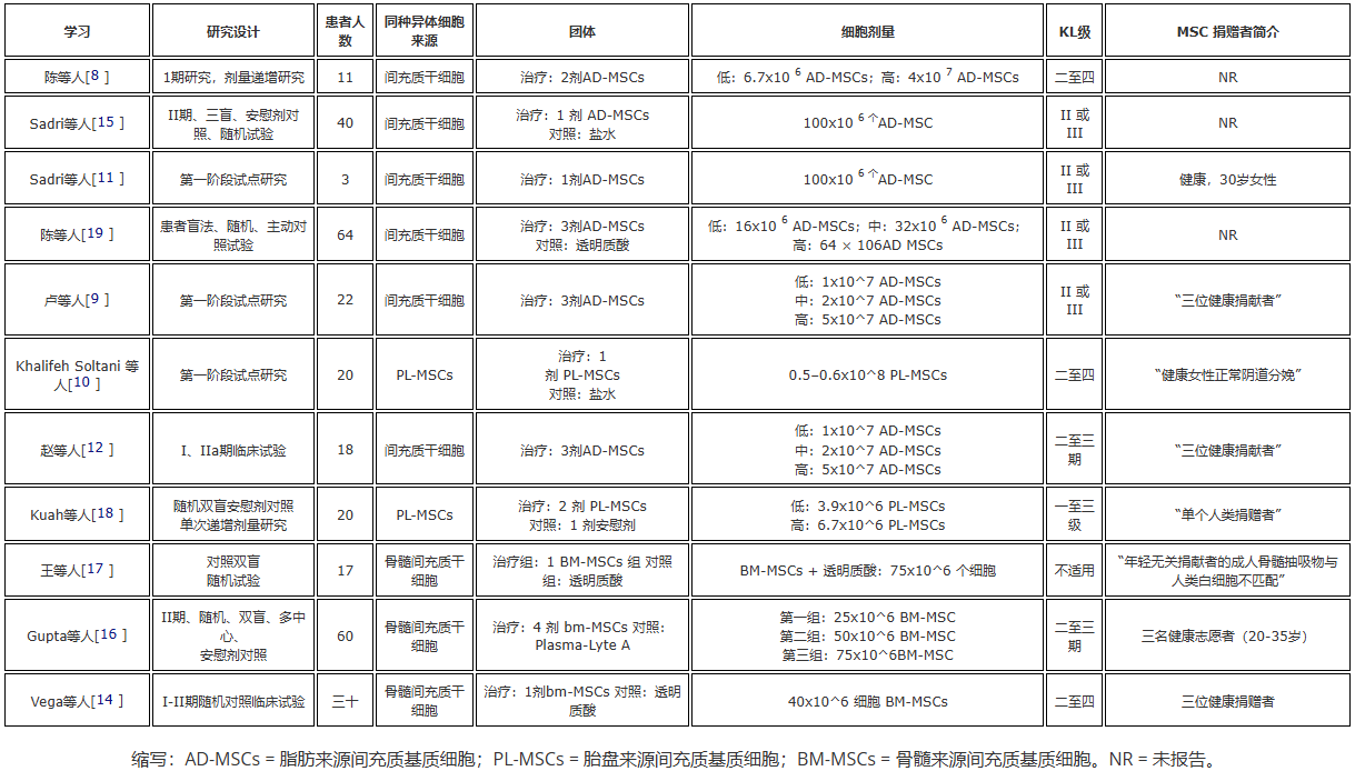 以下是基于研究中使用的同種異體細胞來源治療骨關節炎的總結。