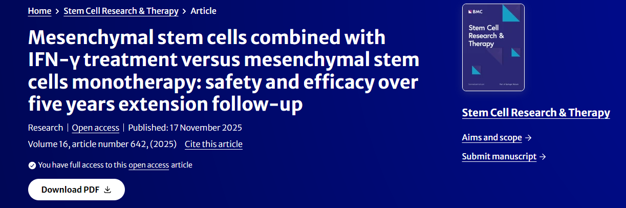 [1]Yang, Y., He, X., Yao, M. et al. Mesenchymal stem cells combined with IFN-γ treatment versus mesenchymal stem cells monotherapy: safety and efficacy over five years extension follow-up. Stem Cell Res Ther 16, 642 (2025). https://doi.org/10.1186/s13287-025-04772-x