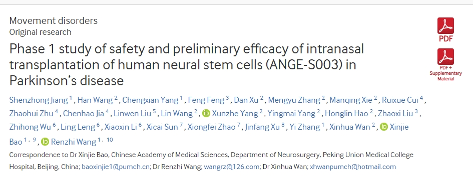 2024年5月10日,北京協和醫院神經外科王任直教授、包新杰教授和神經內科萬新華教授團隊從5年前啟動了一項《人類神經干細胞鼻腔內移植治療帕金森病的安全性及初步療效的1期研究(ANGE-S003)》的臨床研究成果在國際期刊《Journal of Neurology, Neurosurgery& Psychiatry》上發表。[1]