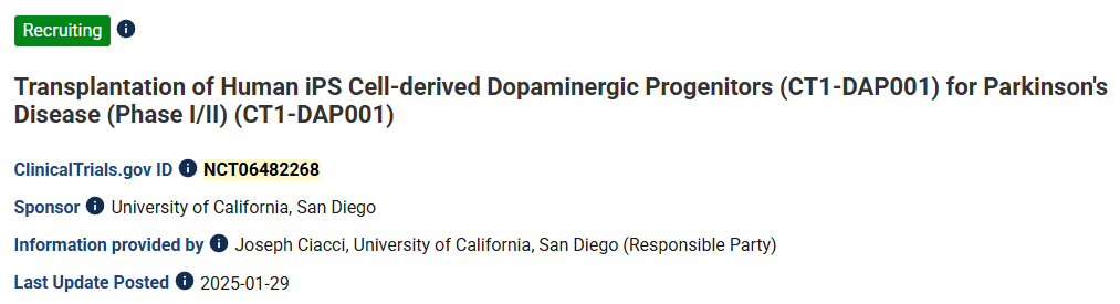 研究設計:一項開放標簽試驗,將患者自體來源的誘導多能干細胞(iPSCs)衍生的多巴胺能祖細胞(由患者自身血細胞生成)移植到患者體內。試驗將招募6名患者,所有患者均接受相同數量的細胞(劑量未公開),通過殼核內注射的方式進行移植。試驗對象為年齡在55至80歲之間、確診帕金森病至少5年的帕金森病患者。