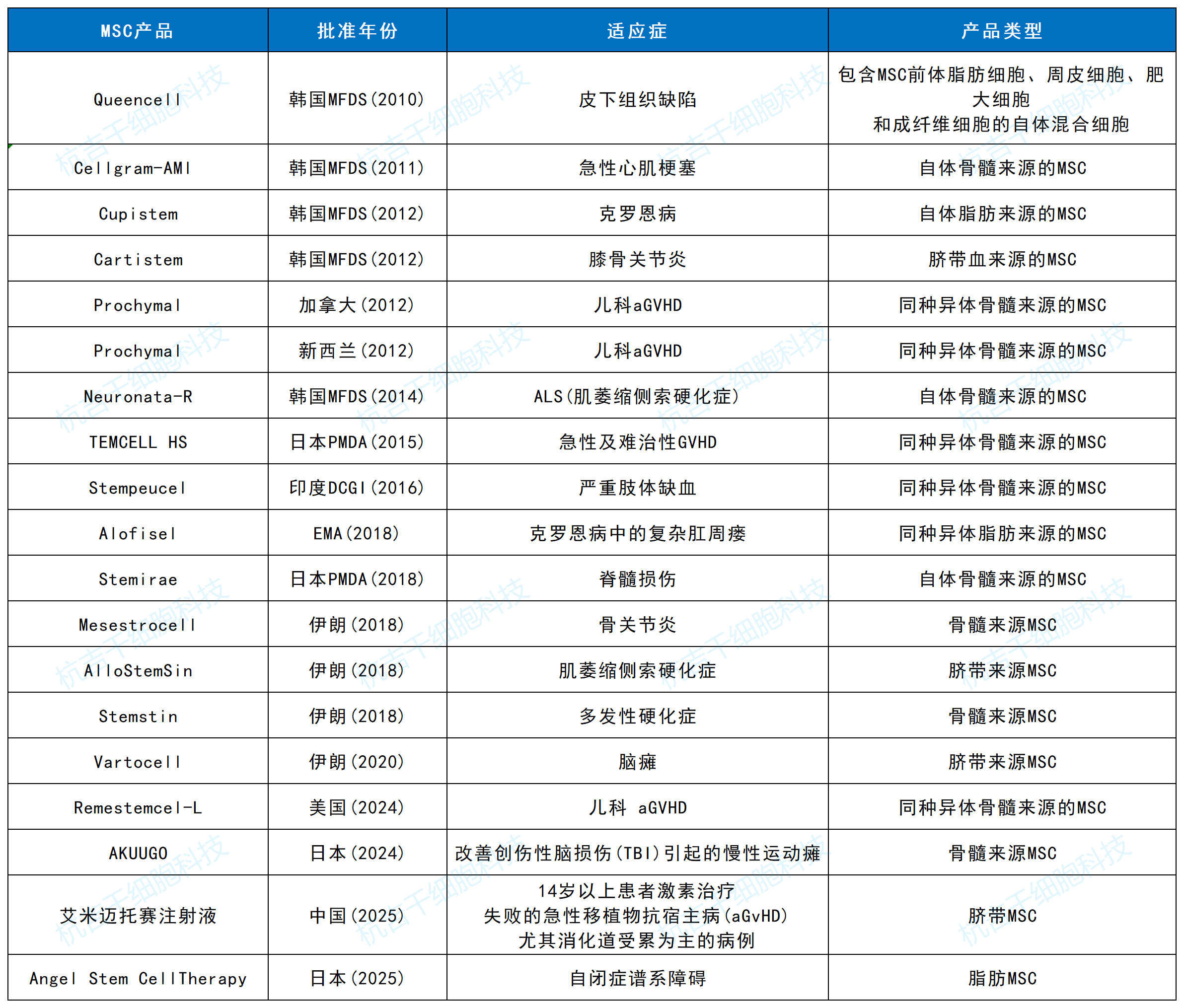 這一格局清晰表明,東亞(中、日、韓)已成為全球MSC療法商業化應用的核心區域,其中中國憑借龐大的市場潛力、快速進步的研發體系和日益開放的監管態度,正迅速成長為全球不可忽視的領導者之一。