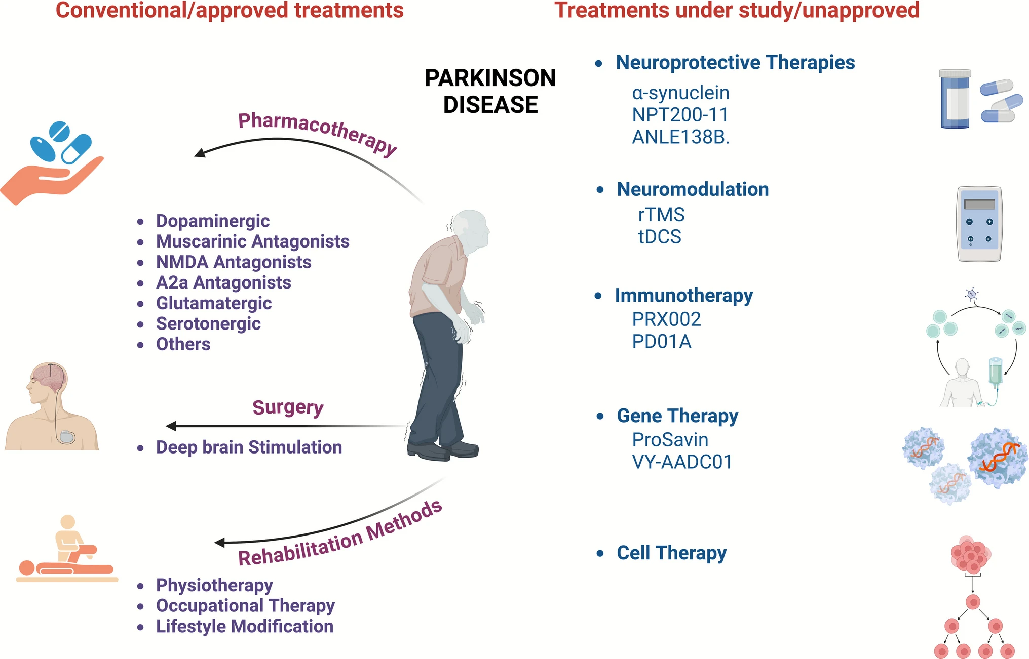 盡管現(xiàn)代醫(yī)學(xué)通過藥物(如左旋多巴)和手術(shù)(如深部腦刺激)手段能夠有效控制部分運(yùn)動(dòng)癥狀,但所有現(xiàn)有療法均屬于對癥治療,無法從根本上延緩或阻止黑質(zhì)多巴胺能神經(jīng)元的退化進(jìn)程,這構(gòu)成了當(dāng)前臨床治療的主要局限(圖1)。