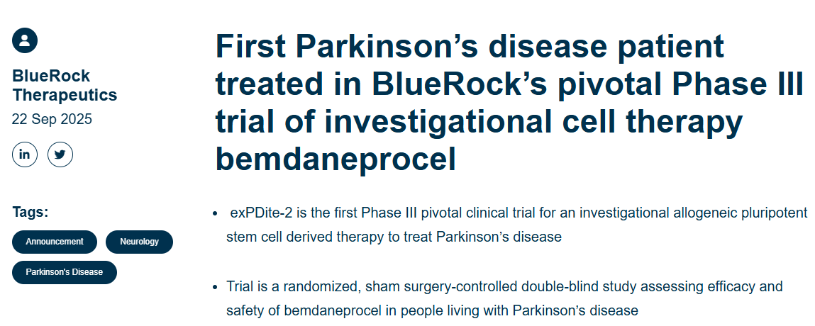 美國BlueRock Therapeutics公司開發的細胞療法bemdaneprocel,于2025年9月啟動了名為“exPDite-2”的關鍵性三期臨床研究,這是全球首個進入三期臨床的干細胞衍生療法治療帕金森病的試驗。