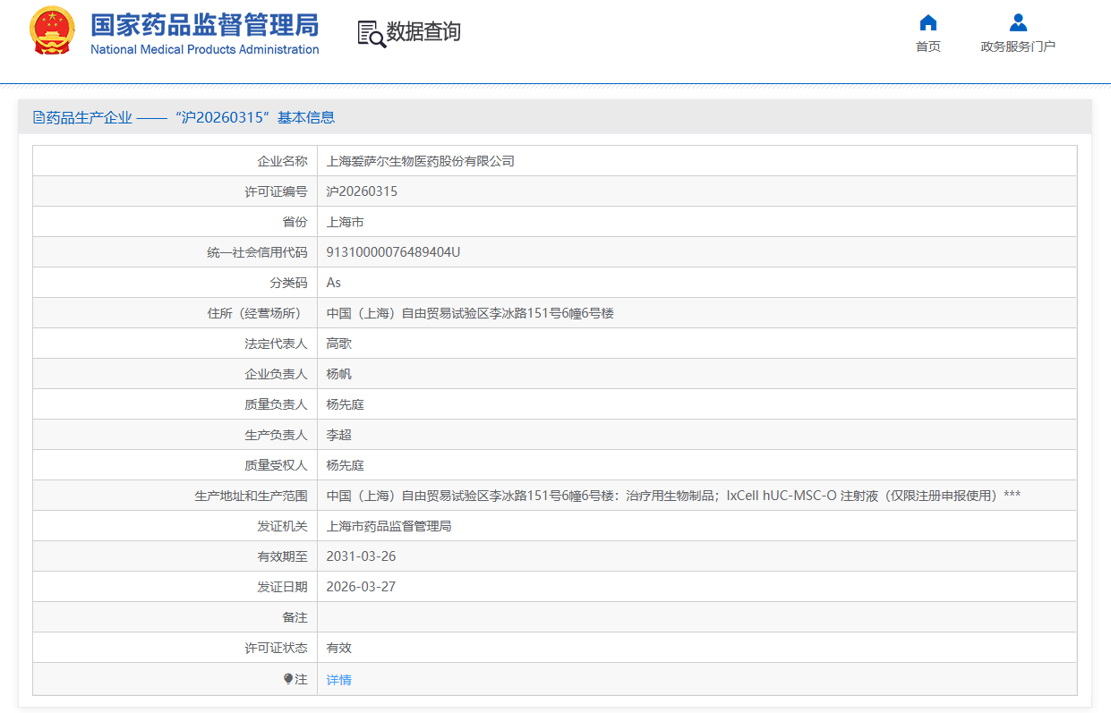 2026年4月6日,上海市藥監局正式核發今年全國首張干細胞《藥品生產許可證》,上海愛薩爾生物醫藥股份有限公司成為新年首位獲證企業,許可證編號為滬20260315。許可信息顯示,其生產范圍包括治療用生物制品:IxCell hUC-MSC-O注射液(僅限注冊申報使用)。