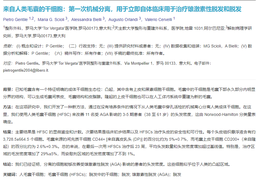 這些研究人員開發了一種在從人類毛囊中收集活組織檢查后使用離心分離人類成體干細胞的方法。研究人員總結他們的發現,“我們已經證明,分離的細胞能夠改善受雄激素性脫發 (AGA) 影響的患者的頭發密度。”