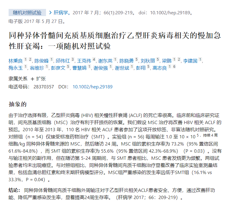 許多研究證明間充質干細胞可以有效治療動物模型中的ALF。同樣,臨床試驗中間充質干細胞對肝衰竭患者也有治療作用。在一項隨機對照試驗中,外周輸注同種異體骨髓間充質干細胞對于乙型肝炎相關的ACLF患者是安全有效的,并且通過改善肝功能和降低嚴重感染的發生率來顯著提高24周生存率。