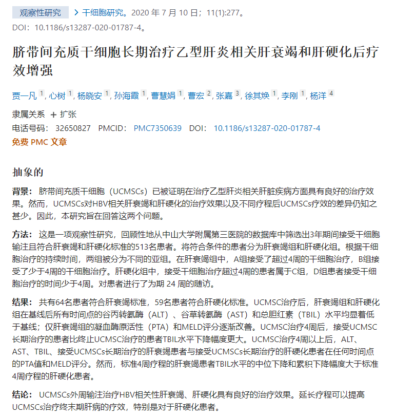 在彭進行的一項臨床試驗中等人,經肝動脈單次移植自體骨髓間充質干細胞2~3周后,患者的白蛋白、總膽紅素和凝血酶原時間明顯改善。然而,在192周的隨訪中,MSC移植并沒有為肝衰竭患者帶來生存獲益。間充質干細胞治療肝衰竭的療程尚不確定。