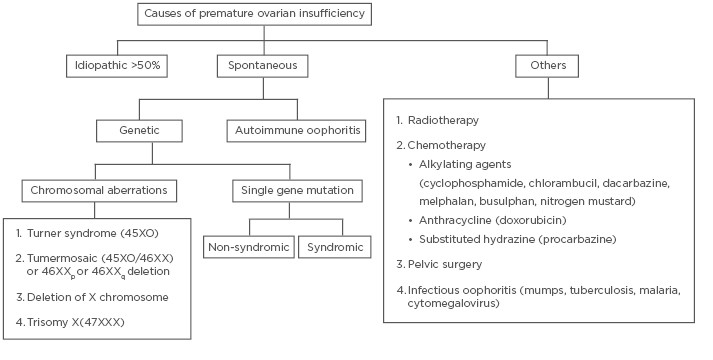 在其他遺傳原因中,脆性 X 前突變是研究最深入的,是由于FMR1(Xq27.3)的變化引起的。在這種前突變中,CGG三核苷酸重復的數量增加,范圍從55到200。影響的個體患POI的風險增加,從散發病例中的3%到有 POI 家族史的15%。X失活中心(位于 Xq13)附近的任何缺失或重排都會導致患者出現與特納綜合征患者相似的輕微癥狀。位于X染色體短臂上的另一個可導致POI的基因是BMP15。它產生的蛋白質在卵母細胞成熟過程中起著重要作用。一些常染色體基因也已被發現,這些基因的突變會導致卵巢活動減少(FSHR/LHCGR)