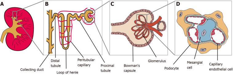 B:腎單位的放大倍數;C:腎小體;D:腎小球。足細胞、系膜細胞和毛細血管內皮細胞是腎小球結構的一部分。