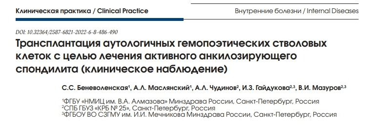 俄羅斯期刊《KAиниЧeckaanpakrka /Clinical Practice》近期發(fā)表了一項(xiàng)名為《自體造血干細(xì)胞移植治療活動性強(qiáng)直性脊柱炎(臨床觀察)》的研究成果。重點(diǎn)介紹了干細(xì)胞移植治療重度強(qiáng)直性脊柱炎患者的7年臨床觀察的結(jié)果。[8]