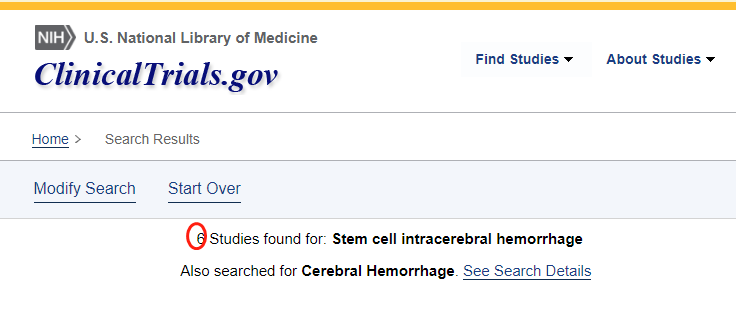 截至2022年12月5日,在美國國立衛生研究院的最大臨床試驗注冊庫clinicaltrials.gov網站上注冊的有關干細胞治療腦出血的臨床研究項目有6項。