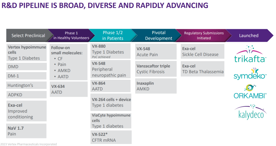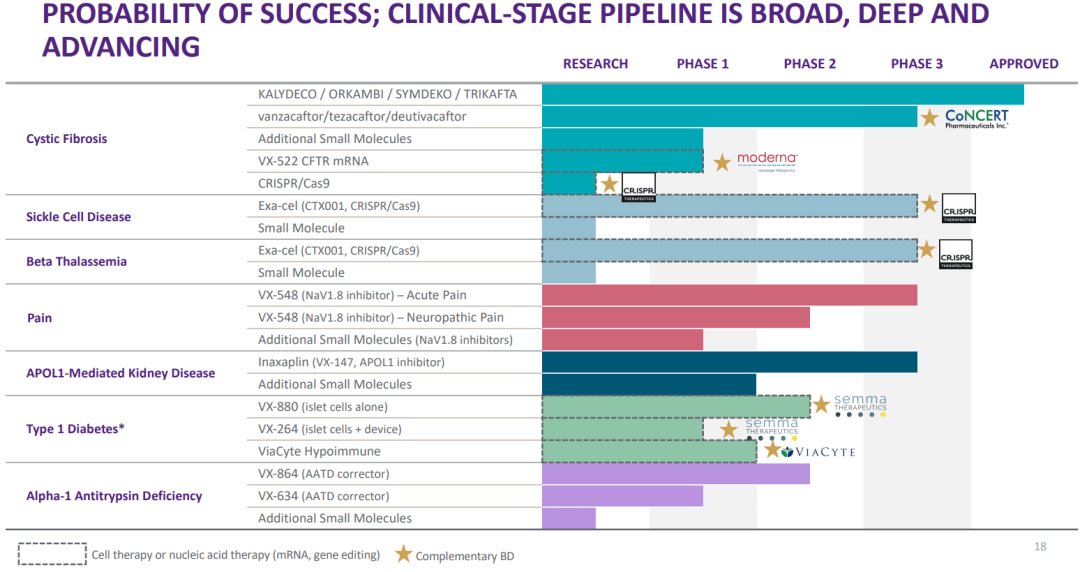 目前,Vertex除了1型糖尿病等自身免疫疾病產(chǎn)品外,其適應(yīng)癥覆蓋甚廣,在杜氏肌營養(yǎng)不良癥(DMD)、肺囊性纖維化(CF)以及肺部和肝臟疾病等領(lǐng)域均有布局。而Vertex與CRISPR合作的全球首款CRISPR基因編輯療法exa-cel已經(jīng)上市在即,Vertex近期引起了不少關(guān)注,其最近動態(tài)也不可謂不頻繁。在3月1日,Vertex還與ImmunoGen達成了一項全球多目標許可和期權(quán)協(xié)議,ImmunoGen授予Vertex使用其ADC技術(shù)進行研究的權(quán)利,以發(fā)現(xiàn)用于基因編輯的新型靶向調(diào)節(jié)劑。結(jié)合近期的動態(tài)來看,Vertex在完善CRISPR基因療法領(lǐng)域的布局的同時,似乎也在嘗試進軍其他領(lǐng)域,管線廣泛覆蓋了基因療法、mRNA、tRNA甚至是ADC藥物。