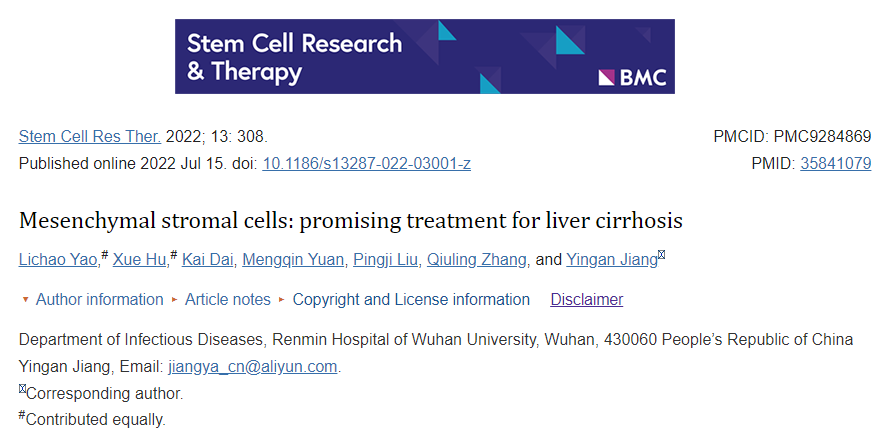 2022年,7月份武漢大學人民醫院感染科在“Stem Cell Research & Therapy”雜志上發布了一篇關于間充質干細胞治療肝硬化的文章。