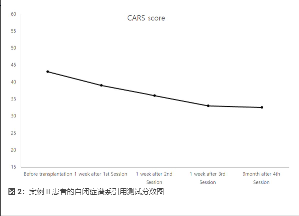 2019年11月至2020年1月進行臨床治療,選擇兒童自閉癥評定量表(CARS)評分>60分的兒童2例。從臍帶中分離出間充質干細胞。注射用細胞數(shù)為1×106/kg。該程序每周重復4~6次。
