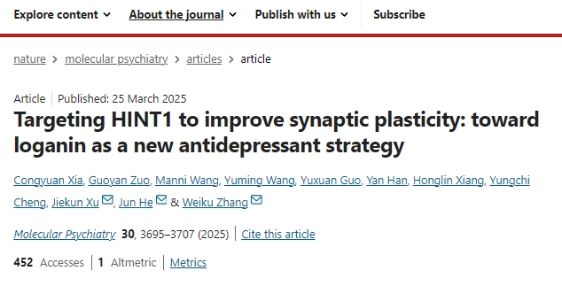 2025年3月25日,北京中醫藥大學續潔琨教授團隊牽頭在IF=9.6期刊《Mol Psychiatry》發表標題為《靶向HINT1改善突觸可塑性:邁向馬錢苷作為一種新的抗抑郁策略》的研究成果。[3]