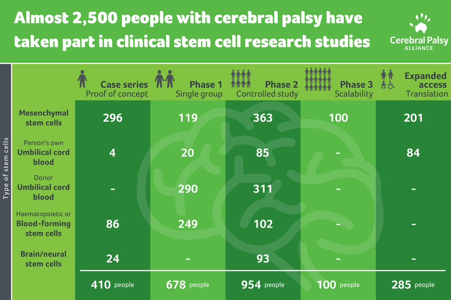- 目前正在研究多種治療腦癱的干細胞療法。我們將其分為5類進行分析(圖1,細胞類型),并對研究環境中接受治療的所有參與者進行了計數。顯示了不同研究階段中每種細胞類型處理的數量。