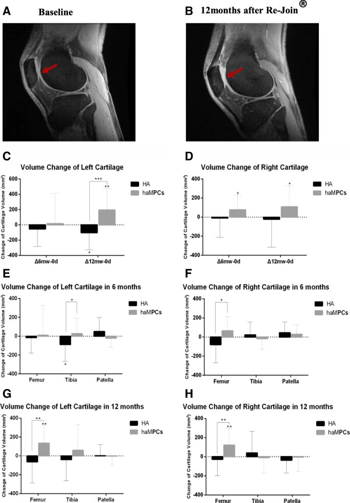總體而言,觀察到股骨和脛骨有減少的趨勢,左脛骨在第6個月發現顯著減少。與HA相比,注射Re-Join?與左側股骨軟骨顯著增加相關(?63.50±222.71mm3對比134.63±189.16mm3) 和右邊 (?26.71±170.69mm3對比121.36±172.25mm3) 第12個月。