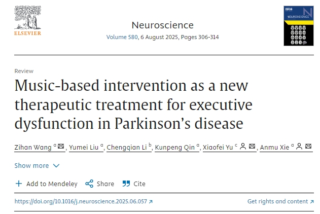 [12]Zihan Wang, Yumei Liu, Chengqian Li, Kunpeng Qin, Xiaofei Yu, Anmu Xie,Music-based intervention as a new therapeutic treatment for executive dysfunction in Parkinson’s disease,Neuroscience,Volume 580,2025,
