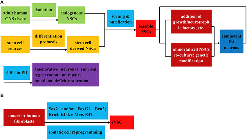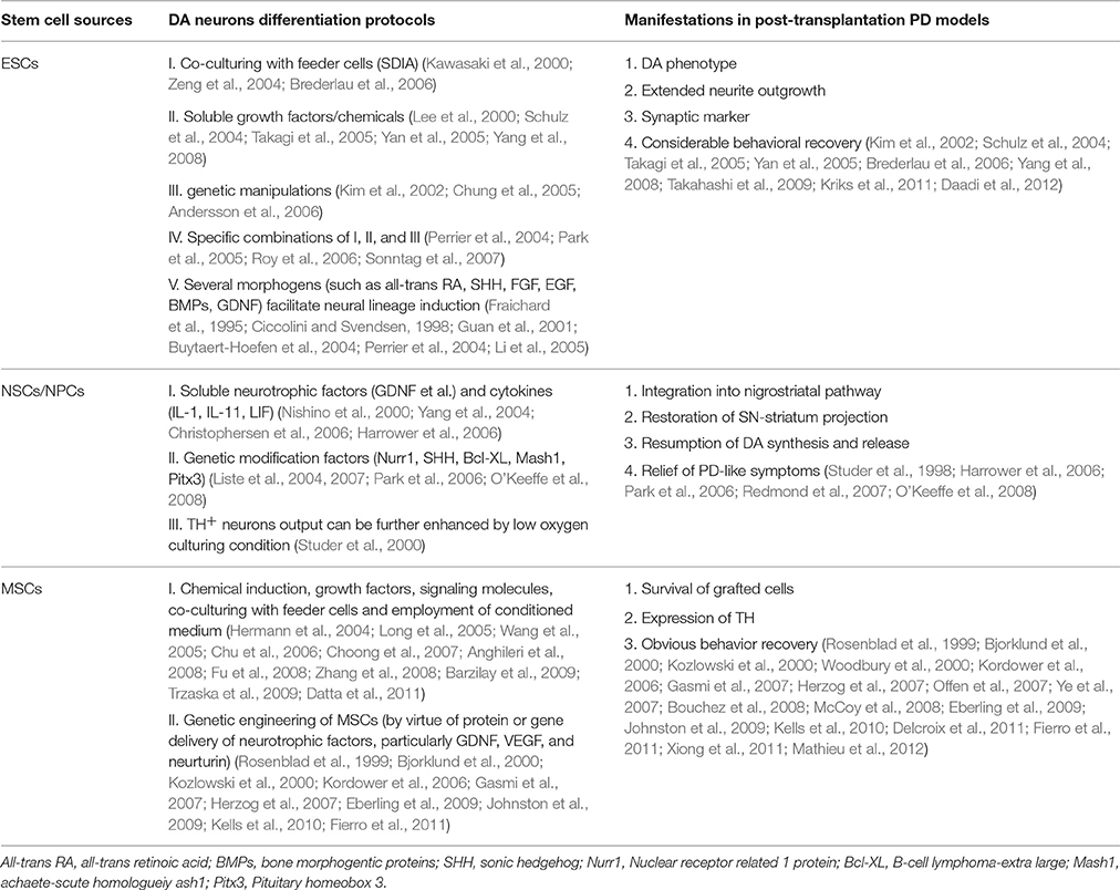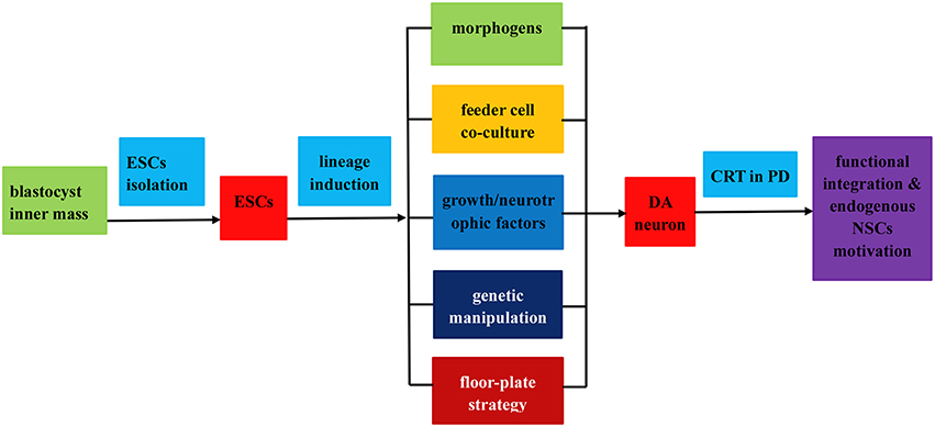 整個過程分為以下三個步驟: (1) 從胚泡內塊分離胚胎干細胞;(2) 通過 (i) 應用形態發生素或可溶性生長因子誘導ESC分化為DA神經元;(ii) 飼養細胞共培養;(iii) 遺傳操作;(iv) 底板譜系誘導策略;(3) 通過功能整合和內源性NPCs動機在PD治療中移植誘導的DA神經元。
