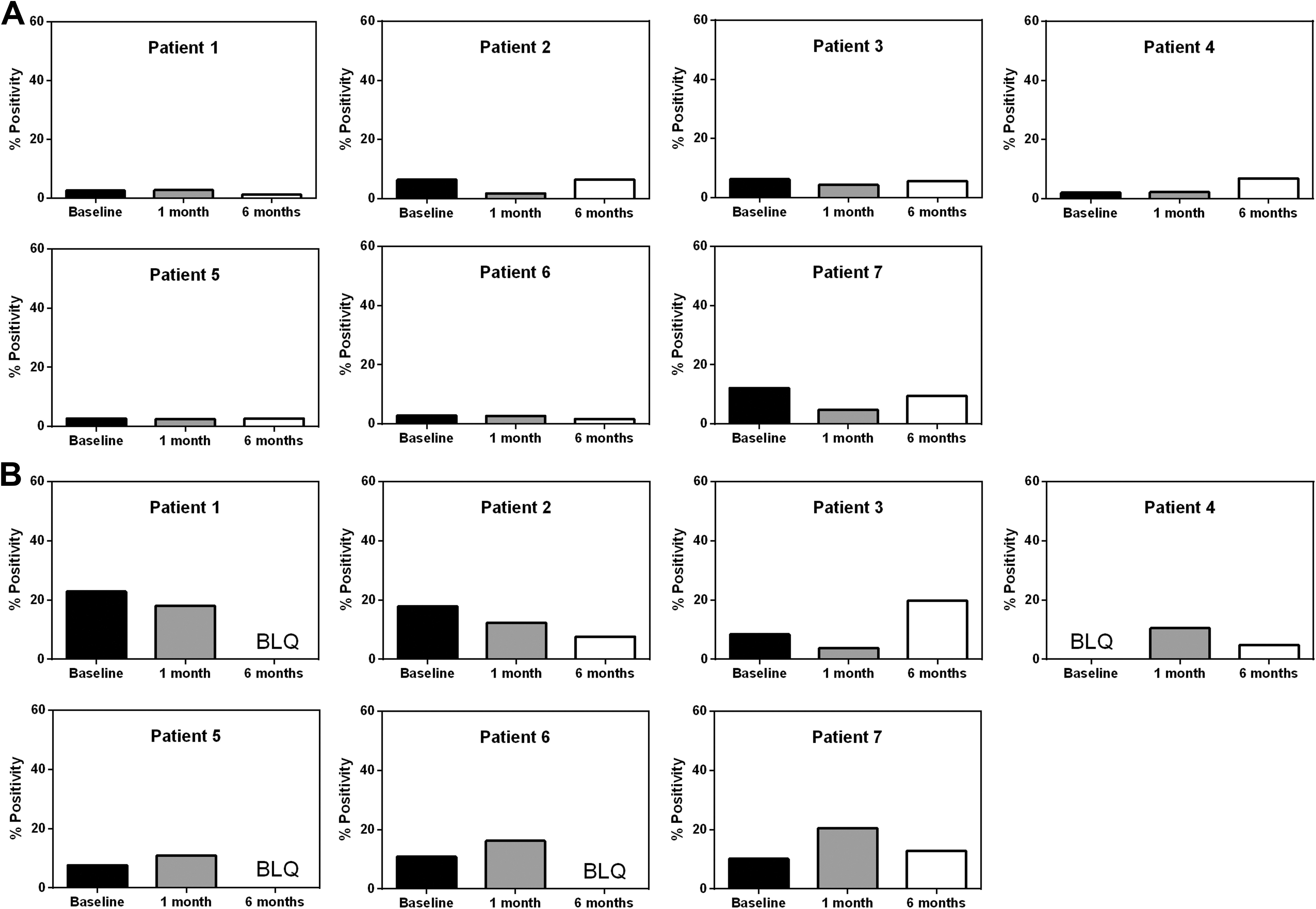 免疫原性:在血清學測定中,在P7中觀察到基線時NPC特異性抗體反應百分比最高,為12%。大多數患者在植入后1個月(服用免疫抑制劑時)和6個月(停用免疫抑制劑時)表現出相似或較低水平的反應,沒有超過12%(圖1A)。在細胞毒性測定中,給定時間段的三個值中的最高值用于評分。觀察到的最高基線是P1 (23%)。在1個月或6個月的隨訪中,沒有患者超過23%的基線(圖1B)。