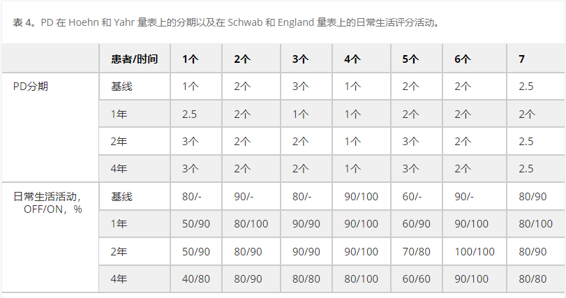在他們的1年、2年和4年評估中,患者在Hoehn&Yahr量表(表4)上的分期以及在Schwab和England量表上的評級(表4)僅顯示出微小的變化,除了P1,誰的分數明顯變差了。