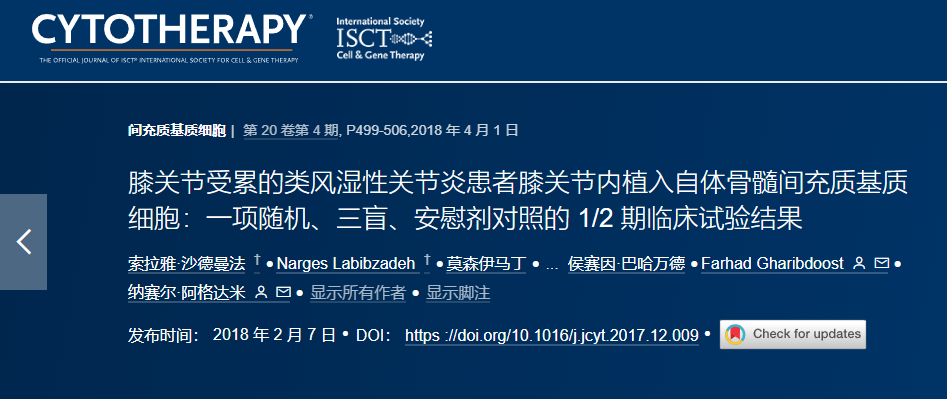 2018年4月,伊朗德黑蘭巴基亞塔拉醫(yī)科大學(xué)在國(guó)際期刊《Mesenchymal stromal cells》上發(fā)布了一篇《膝關(guān)節(jié)內(nèi)植入自體骨髓間充質(zhì)基質(zhì)細(xì)胞治療膝關(guān)節(jié)受累的類(lèi)風(fēng)濕關(guān)節(jié)炎患者:一項(xiàng)隨機(jī)、三盲、安慰劑對(duì)照的 1/2 期臨床試驗(yàn)的結(jié)果》的研究結(jié)果。