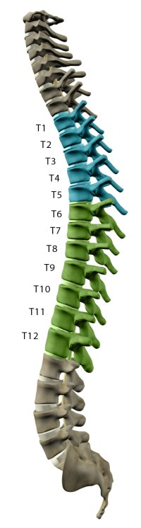 胸椎位于背部的上部和中部。胸椎有12塊椎骨,編號為T-1至T-12。每個數(shù)字對應(yīng)于脊髓該部分的神經(jīng):