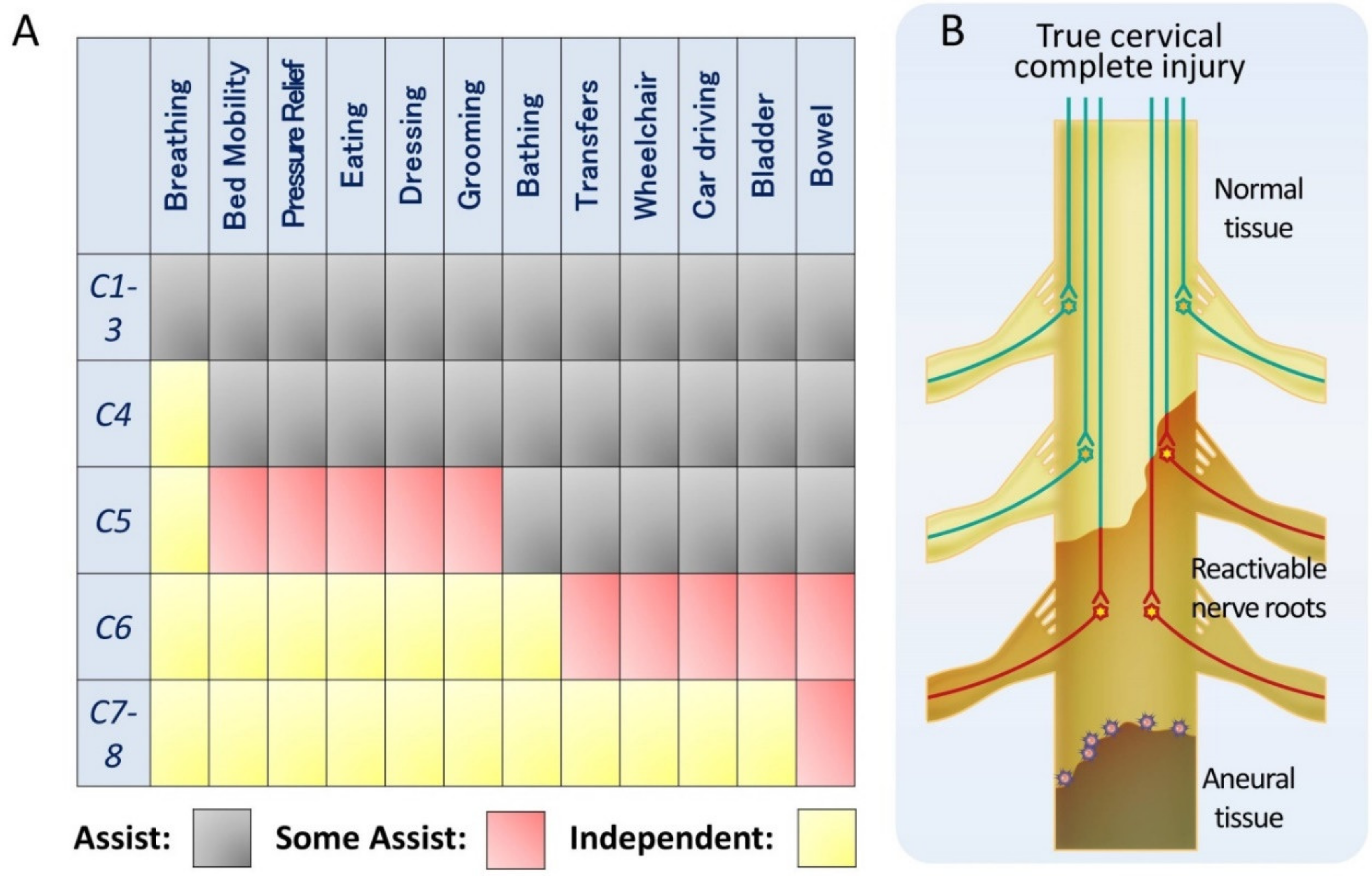 有很多原因可以解釋關(guān)于治療頸脊髓損傷的臨床相關(guān)報(bào)告的稀缺性:評(píng)估上肢功能的困難、呼吸障礙、脊髓休克,以及處理四肢癱瘓的復(fù)雜性,與倫理和護(hù)理問(wèn)題相關(guān)。然而,頸脊髓損傷占脊髓損傷的60%并代表更嚴(yán)重的臨床狀況,因?yàn)樗鼈儠?huì)影響上肢和下肢。在脊髓損傷中,社會(huì)對(duì)治療的需求最高的是頸脊髓損傷。同時(shí),在頸髓中,上肢受神經(jīng)支配的肌肉在每個(gè)髓段上分離得比較清楚。此外,由于上肢比下肢具有更多功能,ADL完全不同,具體取決于殘疾程度(圖2A)。例如,如果功能范圍擴(kuò)展到C6,則可以駕駛汽車。頸脊髓的分段功能化是最有希望的目標(biāo),因?yàn)橹匾闹委熃Y(jié)果,例如臨床試驗(yàn)中的ADL,可以通過(guò)相關(guān)髓段的輕微移動(dòng)來(lái)實(shí)現(xiàn)。