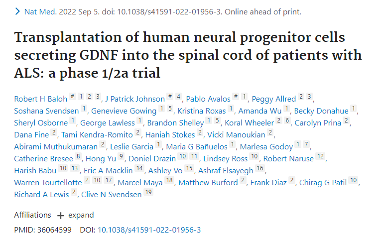 在1/2a期臨床研究(NCT02943850)中,CNS10-NPC-GDNF被移植到18名ALS參與者的腰椎中。主要安全性終點(diǎn)在1年時(shí)達(dá)到,與未治療腿相比,治療腿的移植對(duì)運(yùn)動(dòng)功能沒(méi)有負(fù)面影響。對(duì)死于疾病進(jìn)展的13名參與者的組織分析顯示移植物存活和GDNF產(chǎn)生。