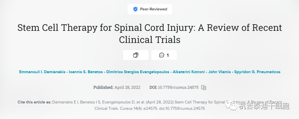 近期,雅典KAT醫院醫學院在《Cureus》醫學雜志期刊上發表一篇關于干細胞療法在脊髓損傷方面進行的臨床試驗的文章,文章側重于介紹SCI的病理生理學、用于治療的不同干細胞療法的特點,以及這些療法在最近發表的臨床試驗中的結果。