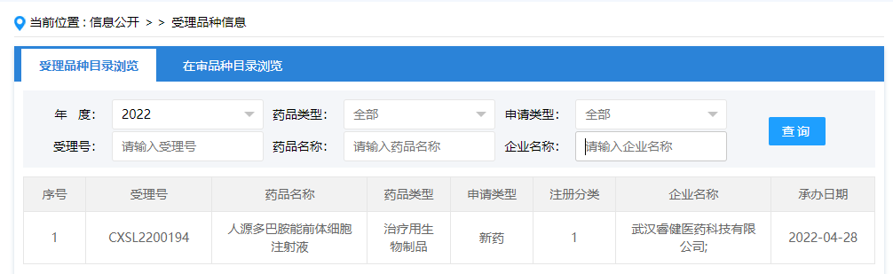 2022年4月28日,據(jù)國家藥監(jiān)局藥品審查中心(CDE)官網(wǎng)-受理品種信息公示,武漢睿健醫(yī)藥科技有限公司(簡稱“睿健醫(yī)藥”)“人源多巴胺能前體細(xì)胞注射液”(代號:NouvNeu001)臨床試驗申請(IND)已獲受理(受理號:CXSL2200194)。