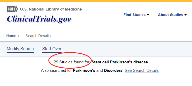 截止2023年2月,在美國國立衛(wèi)生研究院的最大臨床試驗注冊庫clinicaltrials.gov網(wǎng)站上注冊的有關(guān)干細(xì)胞移植治療帕金森病的臨床研究項目有29項,其中中國有7項。所涉及干細(xì)胞類型有神經(jīng)干細(xì)胞、骨髓干細(xì)胞、臍帶間充質(zhì)干細(xì)胞等,其中有些項目已經(jīng)完成,有些正在招募。
