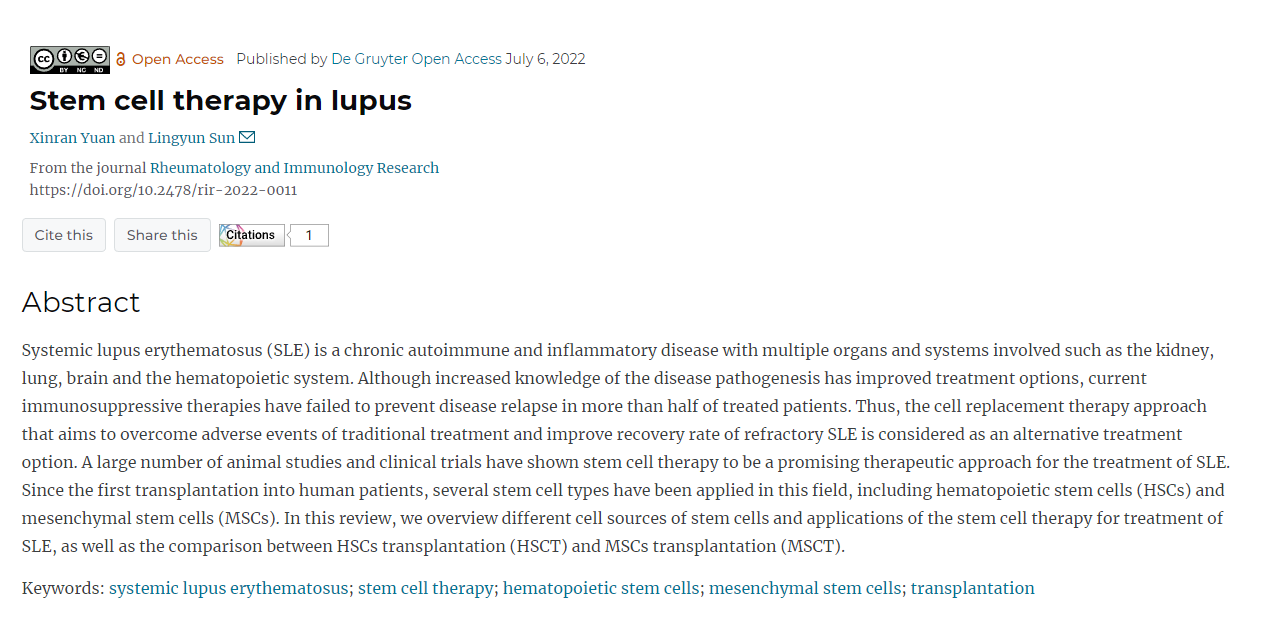 袁欣然與孫凌云。“狼瘡干細胞療法”風濕病學和免疫學研究,卷。3、沒有。2, 2022,第 61-68 頁。https://doi.org/10.2478/rir-2022-0011