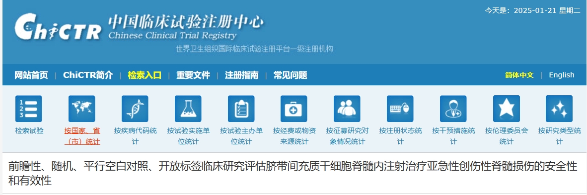 2025年1月20日,西安高新醫(yī)院在《中國臨床試驗中心》上注冊了一項關于“前瞻性、隨機、平行空白對照、開放標簽臨床研究評估臍帶間充質干細胞脊髓內(nèi)注射治療亞急性創(chuàng)傷性脊髓損傷的安全性和有效性”的臨床試驗正在招募患者,這一消息無疑為廣大脊髓損傷患者帶來了新的希望!