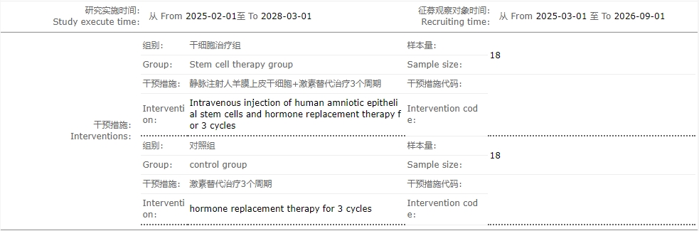臨床試驗二:人羊膜上皮干細胞移植治療早發性卵巢功能不全的安全性和有效性:一項單中心、開放、隨機對照試驗(浙江大學醫學院附屬婦產科醫院)