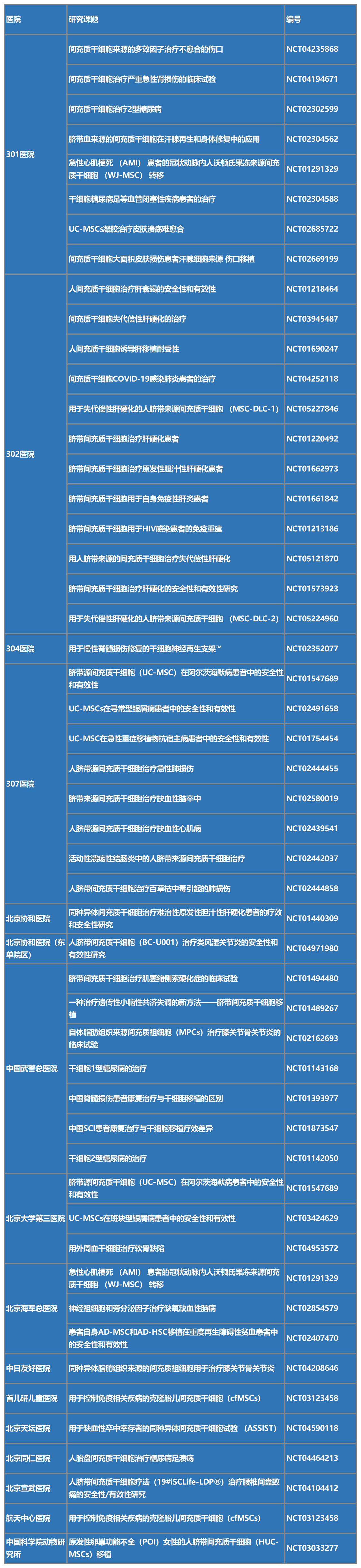 北京,作為我國的首都,一直是中國醫療科研的重要中心。近年來,北京的醫院在干細胞研究領域也取得了顯著的進展。通過在全球臨床試驗注冊平臺ClinicalTrials.gov上的檢索,我們發現北京的多家醫院,包括301醫院、302醫院、304醫院、307醫院、協和醫院、武警總醫院、兒童醫院、同仁醫院以及宣武醫院等,都在積極開展間充質干細胞臨床試驗。(截于2023年5月),包括不限于這些項目: