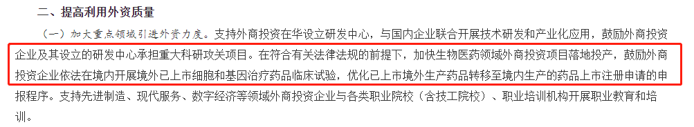 《意見(jiàn)》中的加大重點(diǎn)領(lǐng)域引進(jìn)外資力度,包含支持外商投資在華設(shè)立研發(fā)中心,與國(guó)內(nèi)企業(yè)聯(lián)合開(kāi)展技術(shù)研發(fā)和產(chǎn)業(yè)化應(yīng)用,鼓勵(lì)外商投資企業(yè)及其設(shè)立的研發(fā)中心承擔(dān)重大科研攻關(guān)項(xiàng)目。在符合有關(guān)法律法規(guī)的前提下,加快生物醫(yī)藥領(lǐng)域外商投資項(xiàng)目落地投產(chǎn),鼓勵(lì)外商投資企業(yè)依法在境內(nèi)開(kāi)展境外已上市細(xì)胞和基因治療藥品臨床試驗(yàn),優(yōu)化已上市境外生產(chǎn)藥品轉(zhuǎn)移至境內(nèi)生產(chǎn)的藥品上市注冊(cè)申請(qǐng)的申報(bào)程序。支持先進(jìn)制造、現(xiàn)代服務(wù)、數(shù)字經(jīng)濟(jì)等領(lǐng)域外商投資企業(yè)與各類(lèi)職業(yè)院校(含技工院校)、職業(yè)培訓(xùn)機(jī)構(gòu)開(kāi)展職業(yè)教育和培訓(xùn)。