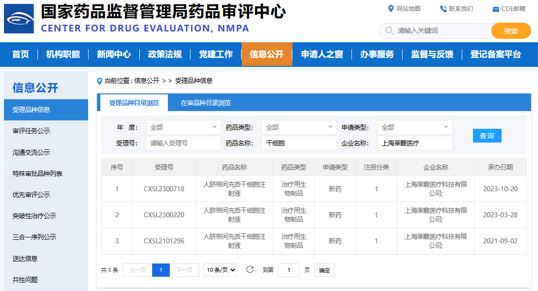 上海代表,上海萊馥醫療科技有限公司,其研發的人臍帶間充質干細胞注射液也在2023年10月20日獲得了批準,批準編號為CXSL2300718。這也是他們第三次獲得IND受理。