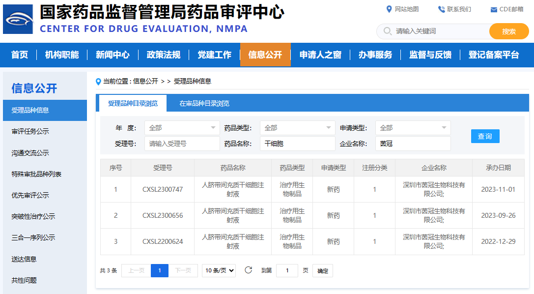 至于深圳,茵冠生物科技有限公司的表現更是令人矚目。短短一個多月的時間里,該公司便有兩款干細胞新藥IND相繼獲得國家藥品監督管理局的受理,其中人臍帶間充質干細胞注射液于2023年11月1日成功獲得受理(受理編號:CXSL2300747)。這不僅展現了茵冠生物在干細胞新藥研發領域的強大實力,也充分體現了其快速反應和創新能力。
